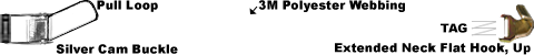 - 3 inch flat sewn loop with CHFL1-1M Flat Hook Quick Disconnect on fixed end, 3 inch flat sewn loop on end of adjustable strap with Pull Loop near Buckle