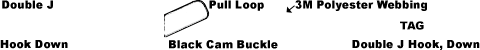 - CHJ1-3M Double J Wire Hook, hook facing down, on each end, sewn-in pull loop on the adjustable strap