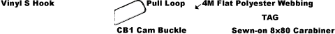 - CHS1V-1M Vinyl Coated S Hook on fixed end, Adjustable strap has a CHCCG8-1M zinc-silver carabiner clip on the end and a sewn-in pull loop