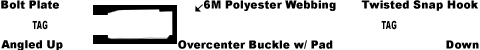 - CFBP2-5M Bolt Plate, Angled up, on fixed end, CHTS2-5M Twisted Snap hook, hook down, on end of adjustable strap