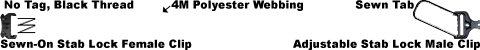 - sewn on Stab Lock Side Release Female End on one end, adjustable Stab Lock Side Release Male Clip on opposite end, sewn tab on loose end