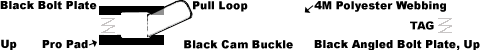 - 1 Inch Black CFBP1K-1M Angled Bolt Plate, Bend Angle Up, On Both Ends, pull loop sewn into adjustable strap