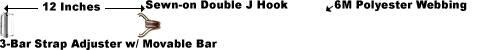 - CHJW2-1M J hook sewn in one foot from strap adjuster, Remaining length of strap extending from the sewn-in J hook