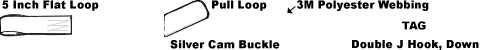 - 5 Inch flat sewn loop on fixed end, CHJ1-3M J Hook, hook down, on adjustable strap and a sewn-in pull loop