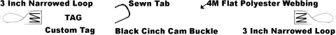 1 Inch Cam Buckle Tie Down Custom Strap Tag, Black Thread CS1K-1M 1 Inch Black Zinc Diecast Cam Buckle 3 inch narrowed sewn loop on each end, adjustable strap has sewn-in tab Fixed End 0.5 Ft (6 Inches) Adjustable Strap 5 Ft Total Strap Length 5.5 Ft (66 Inches) CW1-W4FPE 1 Inch 4M White Polyester Flat Webbing 1050 lb Break Strength 350 lb Working Load Limit Assembled in the USA