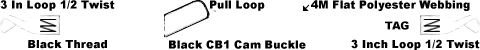 1 Inch Cam Buckle Tie Down Black Thread CB1K-1M 1 Inch Black Cam Buckle 3 inch Sewn Loop with 1/2 twist on fixed end, Adjustable strap has a 3 inch sewn loop with 1/2 twist on the end and a pull loop near the buckle Fixed End 0.5 Ft (6 Inches) Adjustable Strap 5 Ft Total Strap Length 5.5 Ft (66 Inches) CW1-W4FPE 1 Inch 4M White Polyester Flat Webbing 1200 lb Break Strength 400 lb Working Load Limit Assembled in the USA
