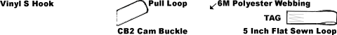 - CHS1V-3M Vinyl Coated S Hook on Fixed End, 5 inch flat Sewn Loop on end of adjustable strap