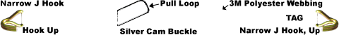 - CHJN1-3M Narrow Opening Double J Wire Hook, hook facing up, on the fixed end strap, On the adjustable strap, CHJN1-3M Narrow Opening Double J Wire Hook, hook facing up, on the end and pull loop next to the buckle for easy tightening